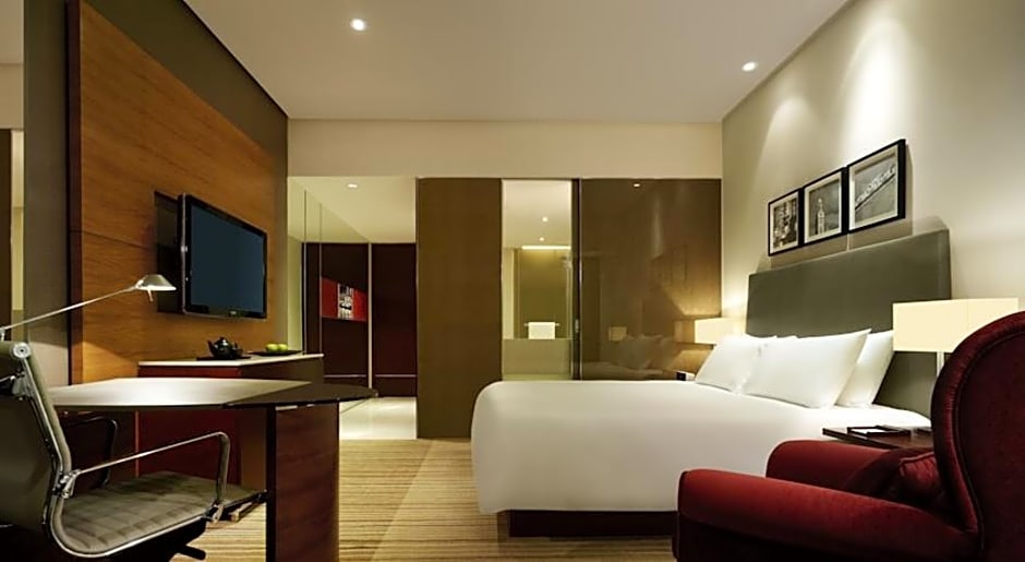 Located on top three floors of the hotel, this room includes private lounge, concierge and secretarial services. Here, rooms with an average size of 31-square-yard feature plush 2 single beds, marble bath with rain shower and separate tub and spacious work area. Enjoy city views that complement modern, cozy decor, as well as 55-inch flat-screen TV and room service. Daily complimentary continental buffet breakfast, all-day coffee/tea service, evening cocktails and canapés are also offered in the exclusive Regency Club Lounge.